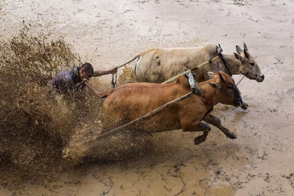 Pacu jawi dikendalikan oleh seorang joki tanpa alas kaki dengan alat bajak sebagai tempat berpegangan dan bertumpu yang dikaitkan pada sepasang sapi dan kemudian berlari di dalam sawah berair dan berlumpur. Uniknya sang joki menarik dan menggigit ekor sapi (gigit ikua) agar sapi berlari kencang.