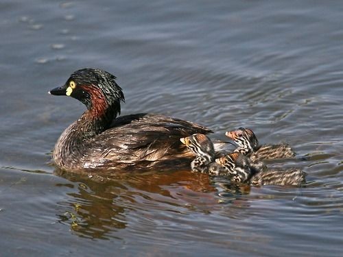 Spesies serupa: dabchick Selandia Baru yang lebih besar dan lebih gelap memiliki bagian depan leher dan dada merah rufous yang lebih luas, dan tidak memiliki tambalan kecil berwarna kuning pucat di belakang pangkal paruh.